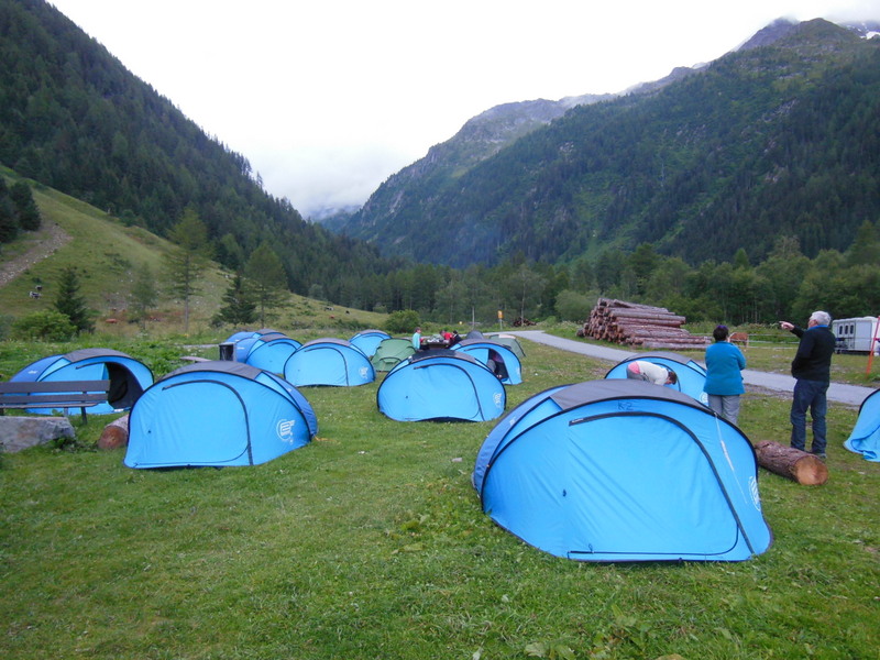 It’s around an hour from Geneva airport to Chamonix, which makes it a magnet for skiers, and once the motorway drive deposited us below the glacier at Les Bossons, we got to grips with our campsite co-operation rules and our Decathlon pop-up tents. Ably demonstrated by John and Graham the pop-up is fine, it’s just folding away that’s the pain. We’ll have to do that every morning before breakfast so we can get an early start on to the hills.
