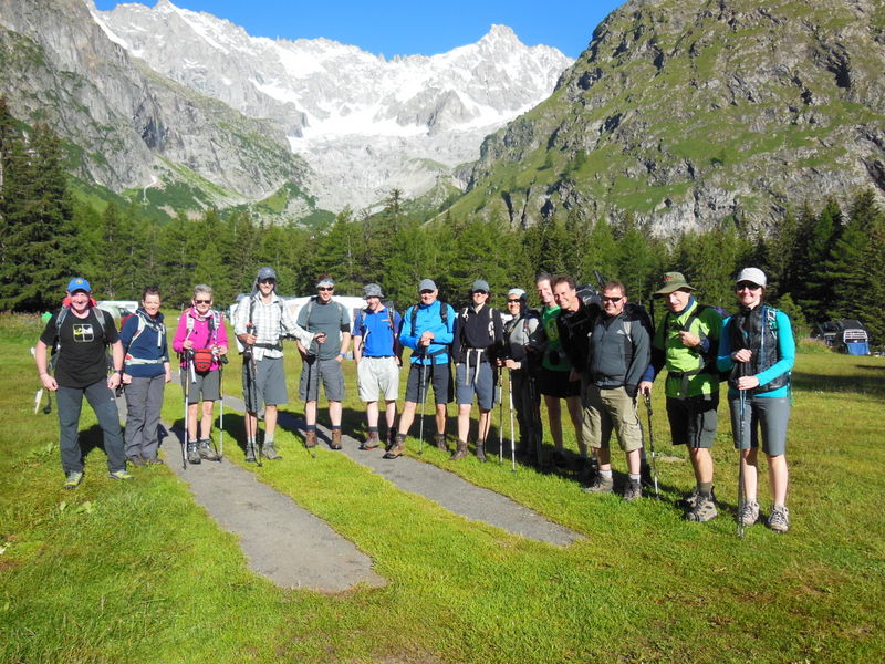 See Exodus Mont Blanc Circuit. A Challenging walk around Mont Blanc in 10 days, 150km and 10,000m of ascent. Camping or Hotel options available.