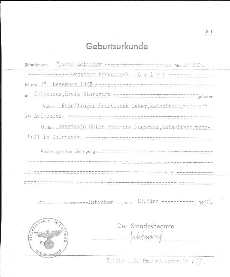 Born 25th December 1922. As told to Peter. Zelgoszcz 83-208, Starogard Gdanski, Poland. Father Franciszek, Mother Anastazja z domu Nagorska. This was a German issued birth certificate from 1942.