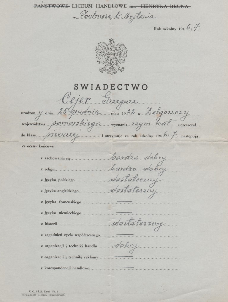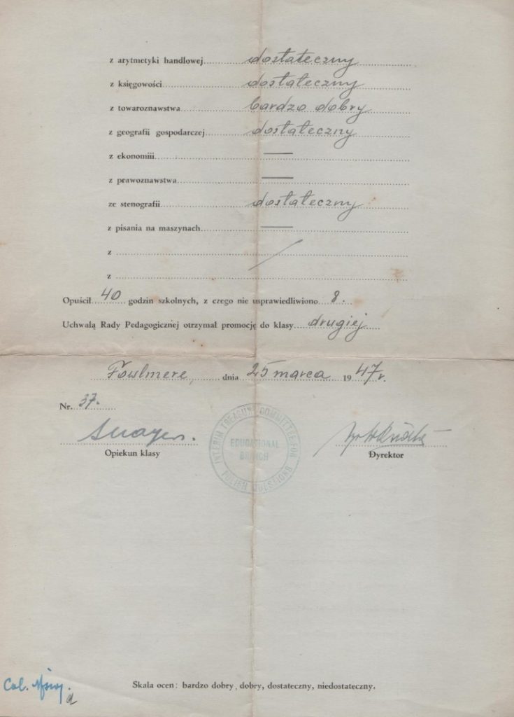 Some details of the camps are provided by Zosia Biegus here. Moved camp to Liceum Handlowe (Trade School), Fowlmere, near Cambridge School report 25.3.1947. Very well behaved and good in Religion. Curiously Polish and English language was ‘Satisfactory’