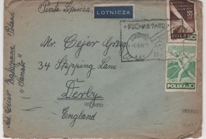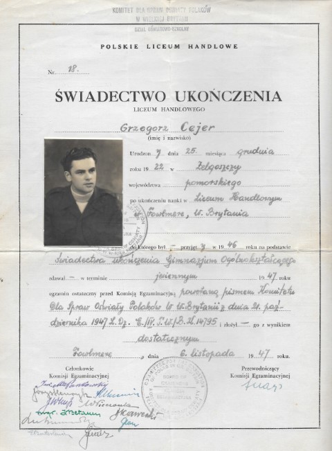 Goldalming. School PKPR. Kettering, England. Demobbed from the Polish army. Arrived Derby in 1946. Leaving certificate from the Polish Trade School.