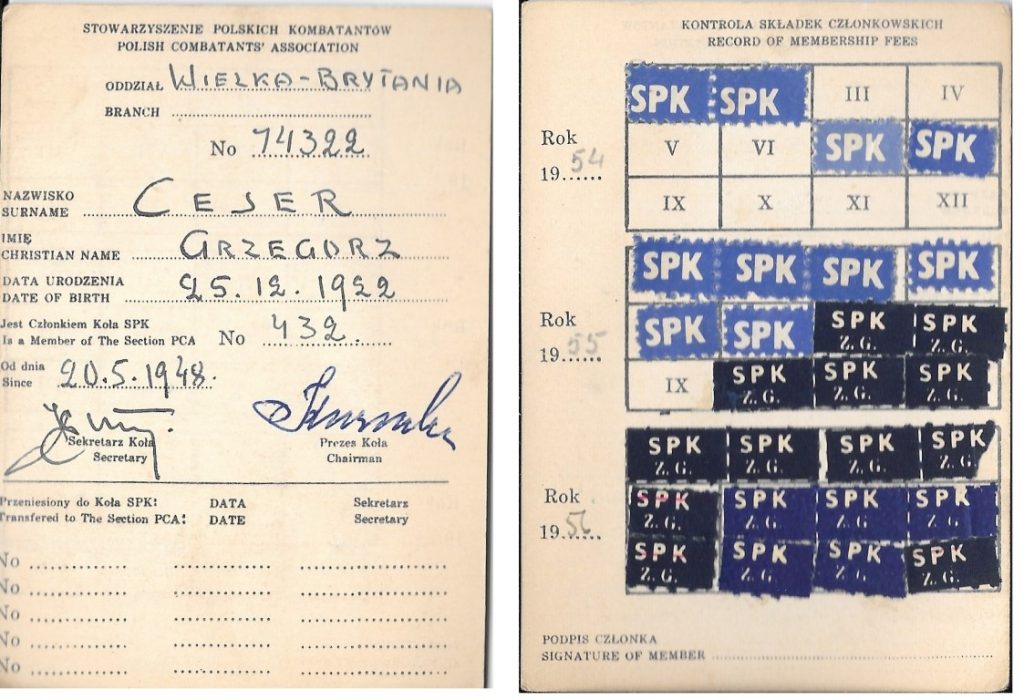 - 20.5.1948. Member of the Polish Combatants Association. This card shows membership payments 1954 through 1956