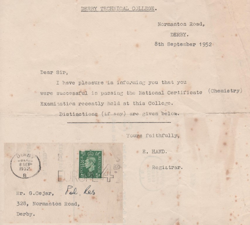 - 1952-Sep at 328 Normanton Road, Derby. National Certificate Exams at Derby Technical college