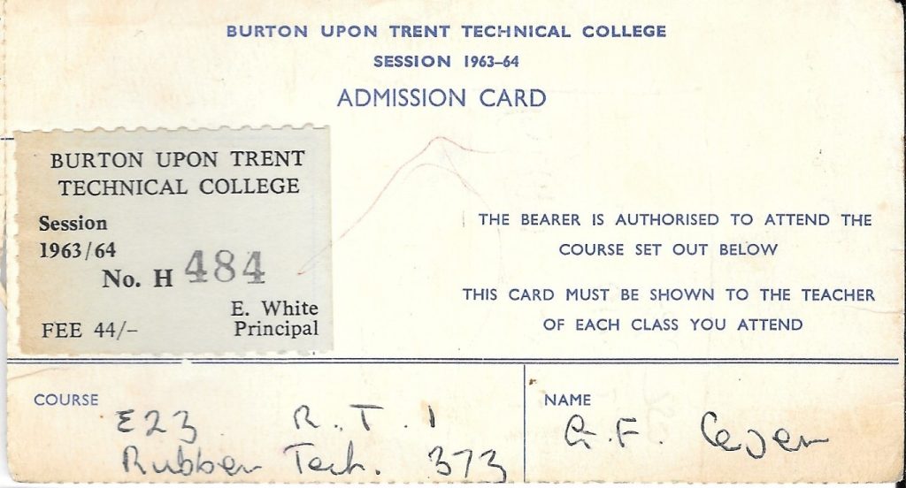 - 1963-4 Attending Burton upon Trent Technical College studying Rubber Tech