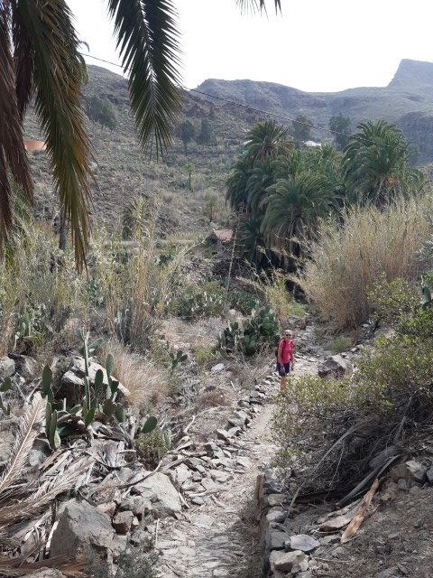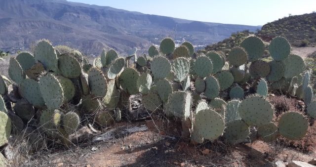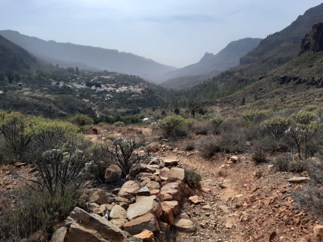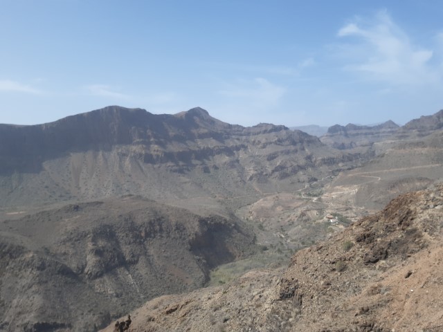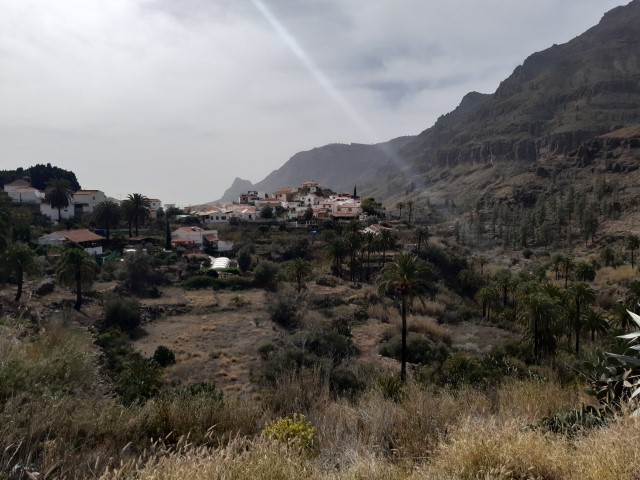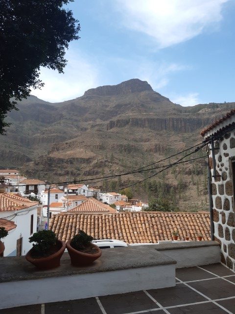 We find wetterpanorama on the TV as a reminder of past things alpine then take a 20 min walk to the 09:30 #18 guagua to San Bartolome. It’s a 6km walk 600m descent to Fataga and a less than decent salad lunch. The bus ride is spectacular. The wind dies down for the afternoon and we see it brings the clouds down inland over the hills.