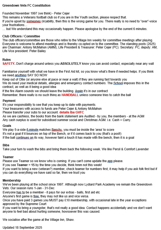 History. The Greendown Vets Football Club was founded in November 1995 [sic Peter Bailey]. Membership began for players old enough to remember when England won the World Cup – i.e. born before July 30th 1966, but as the years have gone on and memories have faded, this restriction has been relaxed to include younger players. We are available for fixtures and happy to entertain local or even international opponents.