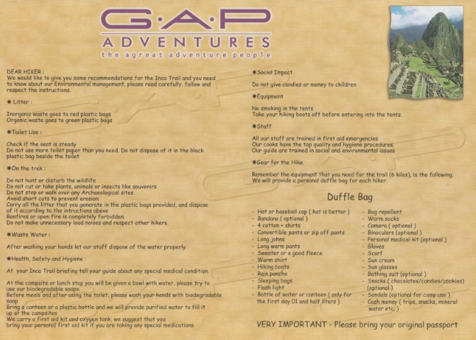 See Gap Adventures Peru Panorama. Of the 253 photos, it’s difficult to pick just a handful. In any case this trip has to be the best you could choose – Incas, Rainforest and every schoolboys favourite: Lake Titicaca. Just one tip though; do everything slowly at altitude.