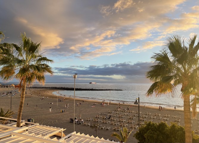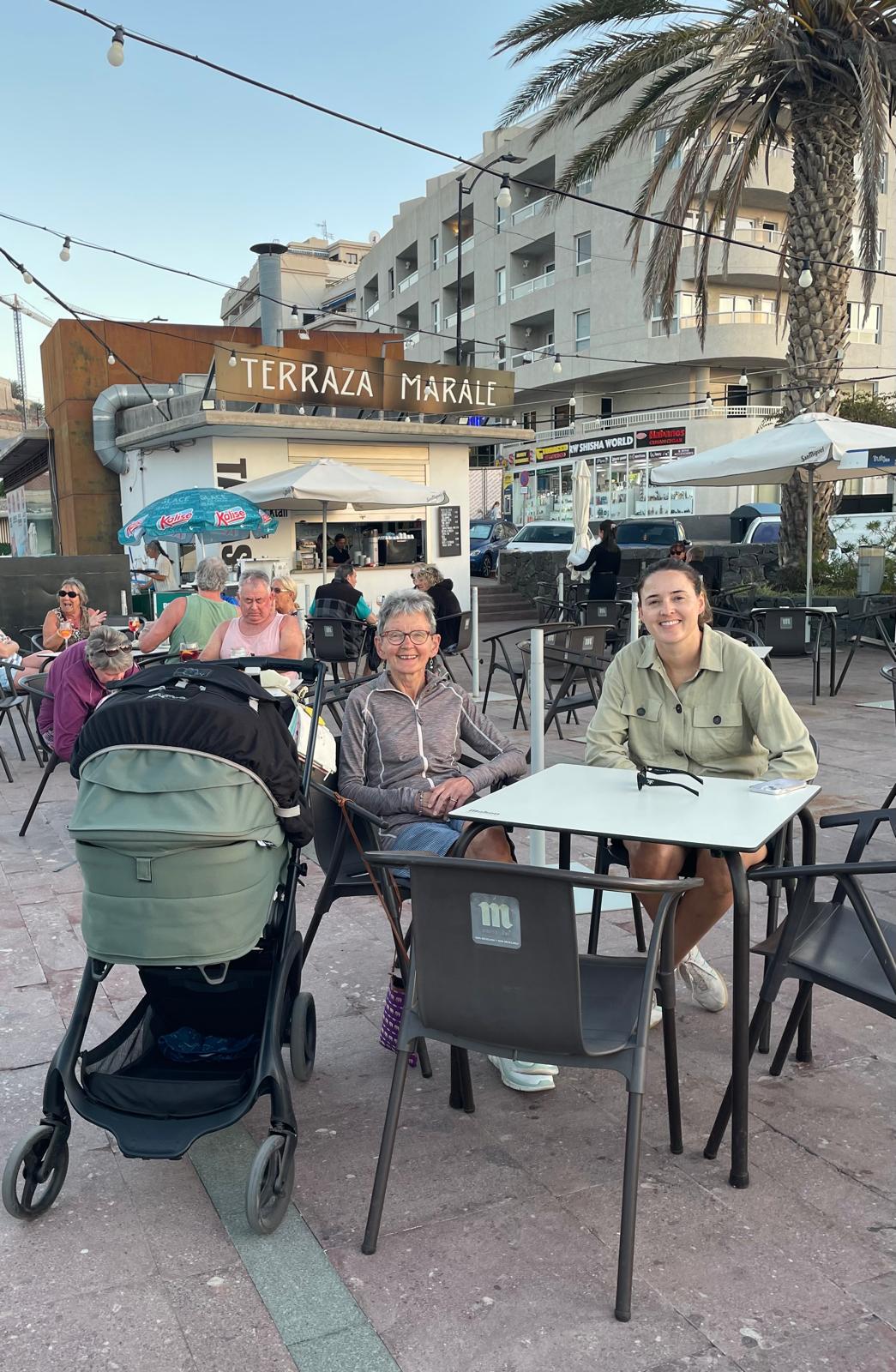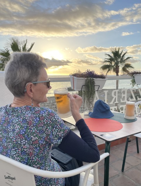 Dinner booked for 6pm at Cielo y Mar proved a struggle to reach as the promenade was closed off because of rough seas. Still it meant views from the top table rewarded us with sunset over La Gomera and crashing waves below. Iberian pigs cheeks, sea bass and seafood spaghetti were all excellent with a ‘tart’ passionfruit and mango mousse and something cakey. Still it made up for a tough tennis test with two 80 yr olds Hugh and Willi reminding us that it’s best kept simple.T-ask behind the marina and the restaurant on the square look good to eat.
