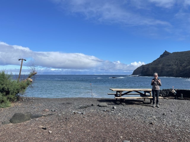 Leaving the ferry the connection to bus#2 was literally confusing but entirely seamless and the e2.50 fare to Hermigua a snip. Climbing up to the Basalto luxury villa an explore to find lunch took us to a dejected Santa Catalina ‘beach’ kicking heels until the El Faro restaurant opened at 13:30. Bright but chilly and everyso slightly dog-eared, was this a good idea for January?